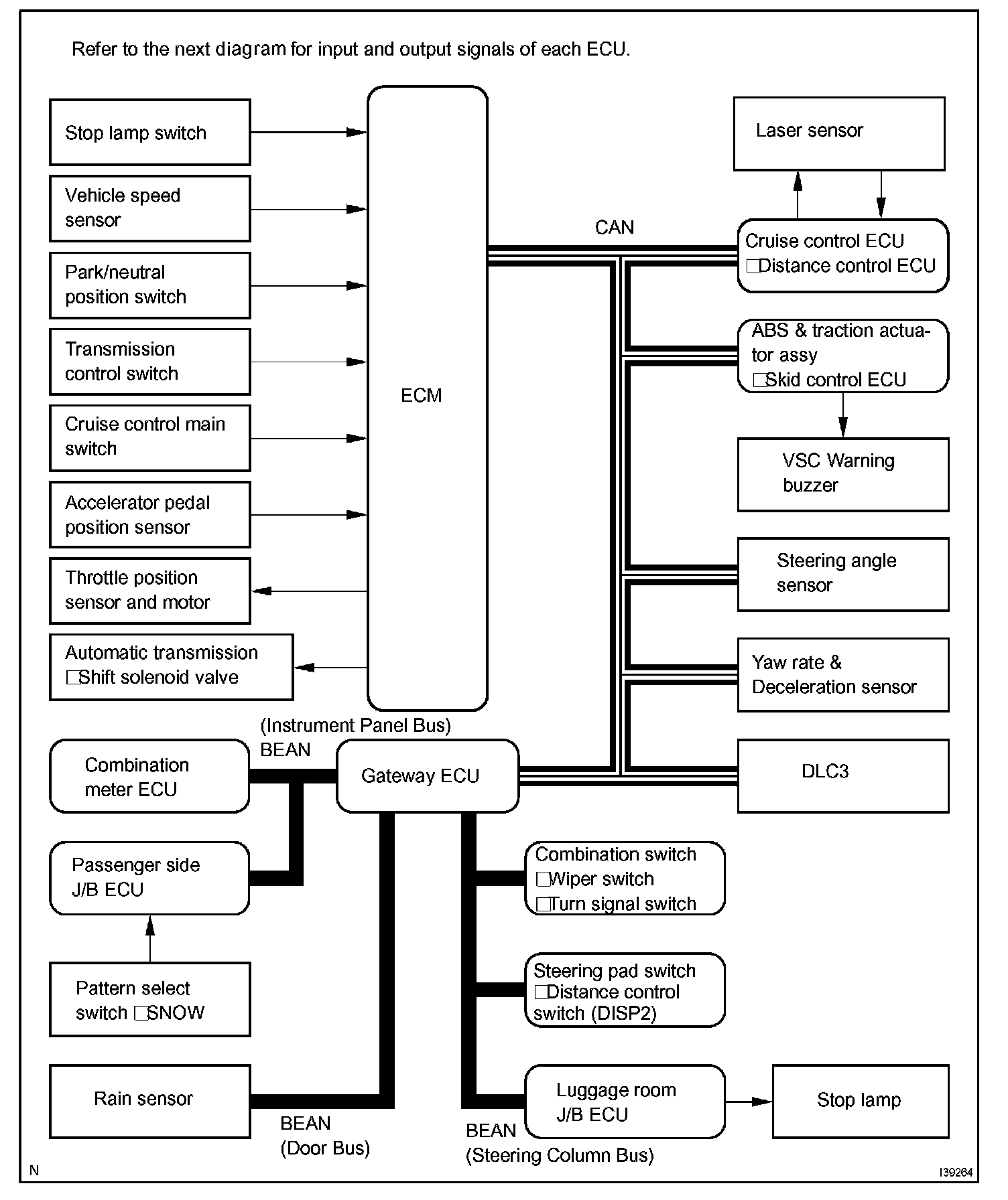 The distance control ECU (cruise control ECU) determines the distance between a vehicle in front and your own, relative speed, target decreasing speed and deceleration rate to transmit a brake demand signal to the skid control ECU via ECM.