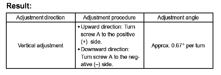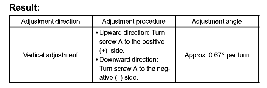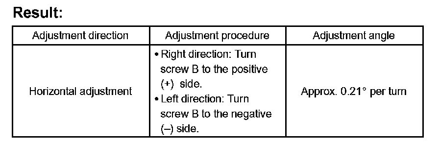 HINT: If "LEFT SIDE: 0.6 °" is displayed, the divergence is 0.6° in the left direction. Give the screw approximately 3 turns to the positive (+) side.