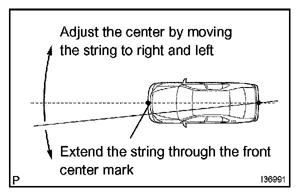 1. From the center (center of the emblem) of the front and rear bumpers, hang down the string with the plumb bob and mark the center points (both front and rear) of the vehicle on the ground properly.