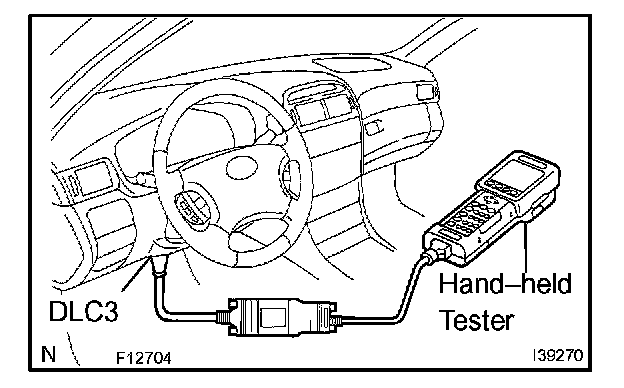 3. Connect the hand-held tester to the DLC3, and turn the power ON.