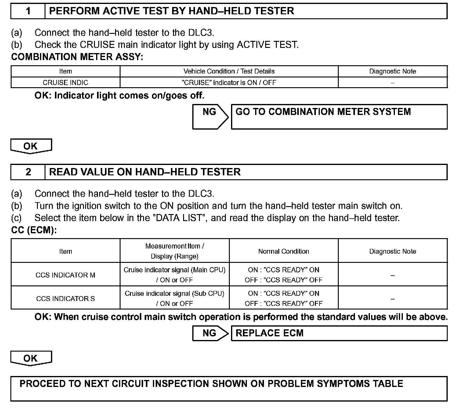 - The ECM detects a cruise control switch signal and sends it to the combination meter via CAN and BEAN. Then the CRUISE main indicator light comes on.