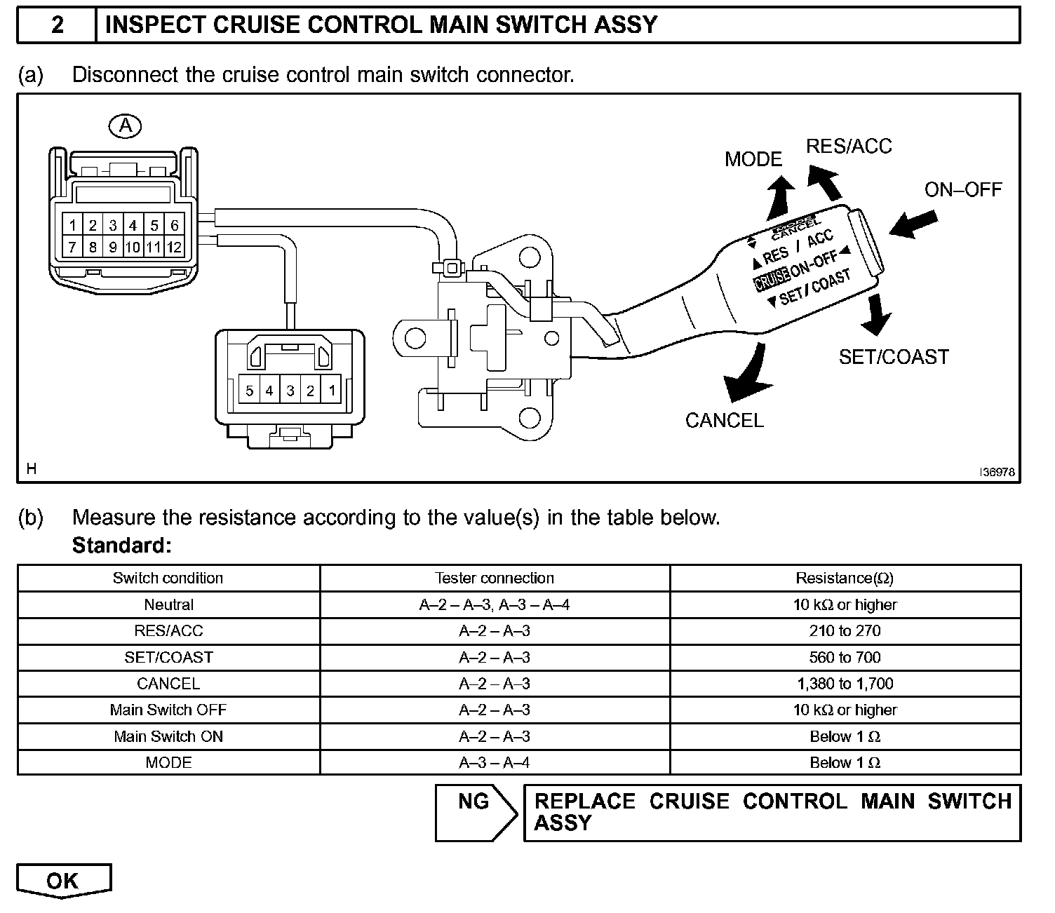 The cruise control main switch operates eight functions: SET, COAST, TAP-DOWN, RESUME, ACCEL, TAP-UP, CANCEL and MODE. The SET, TAP-DOWN and COAST functions, and the RESUME, TAP-UP and ACCEL functions are operated with the same switch. The cruise control main switch is an automatic return type switch which turns on only while operating it in each arrow direction and turns off after releasing it. The internal contact point of the cruise control main switch is turned on with the switch operation. The ECM then reads the resistance value that has been changed by the switch operation to control MODE, SET, COAST, RESUME, ACCEL and CANCEL.