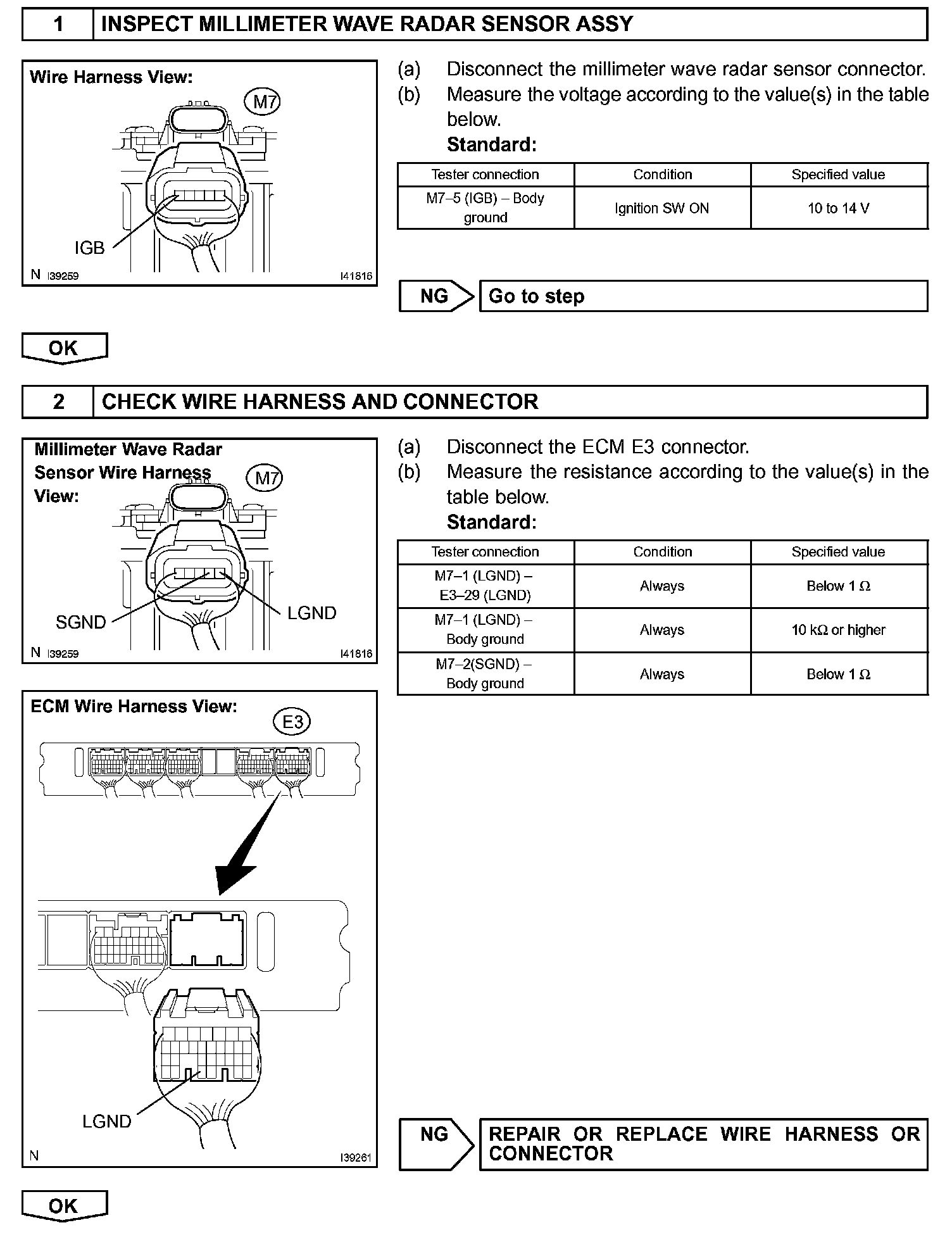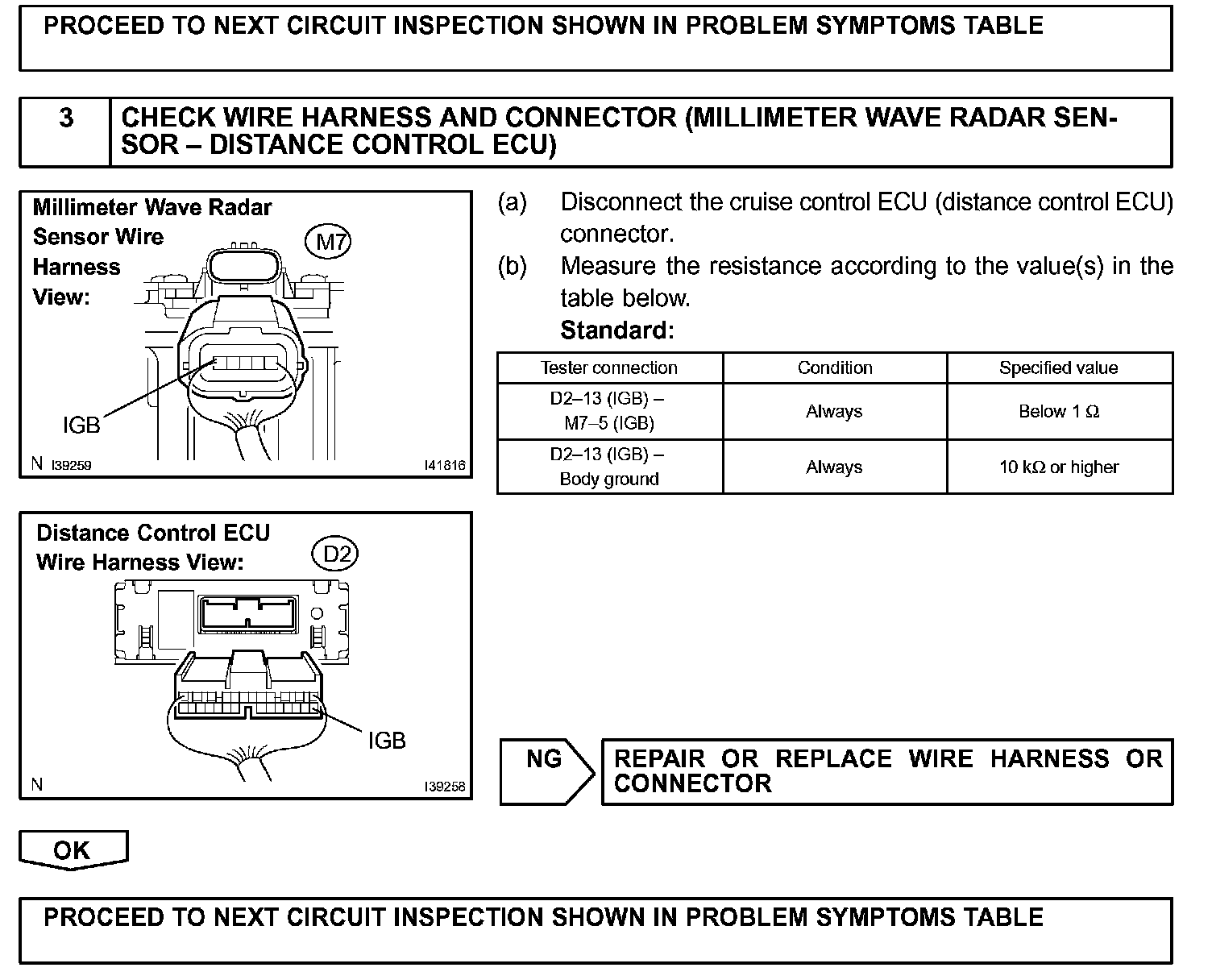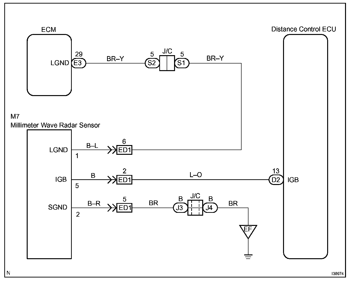 The millimeter wave radar sensor emits radar beams towards an object in front and measures the distance and direction of the object by receiving the beam reflections. Based on the reflections, the sensor calculates the difference in speed between your own vehicle and an object in front. This data is transmitted to the cruise control ECU (distance control ECU).