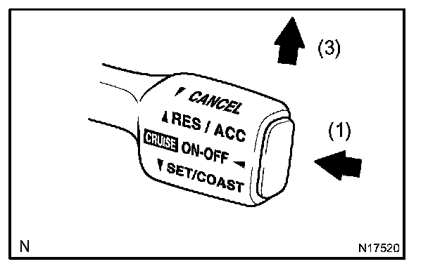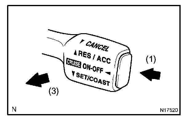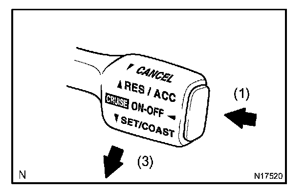 4. Check that vehicle speed decreases while the cruise control main switch is pushed to SET/ COAST, and the vehicle cruises at the newly set speed when the switch is released.