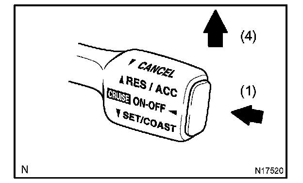 4. Check that vehicle speed increases while the cruise control main switch is pushed to RES/ACC, and that the vehicle cruises at the newly set speed when the switch is released.