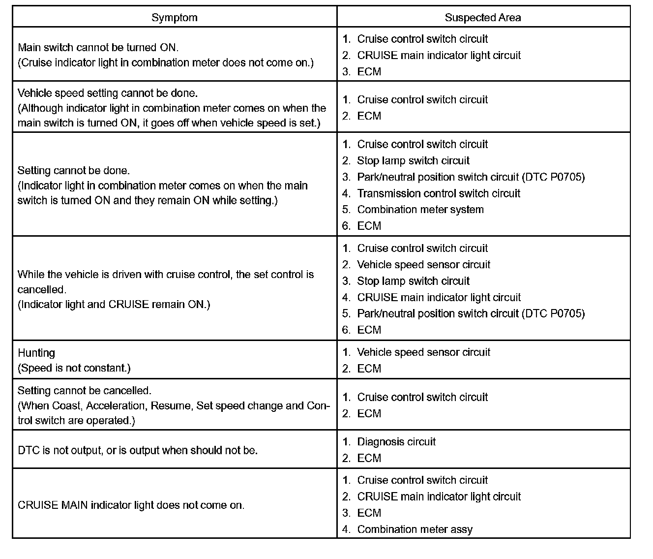 HINT: Inspect the "Fuse" and "Relay" before confirming the suspected areas as shown in the chart. Inspect each malfunction circuit in numerical order for the corresponding symptom.