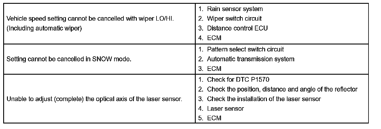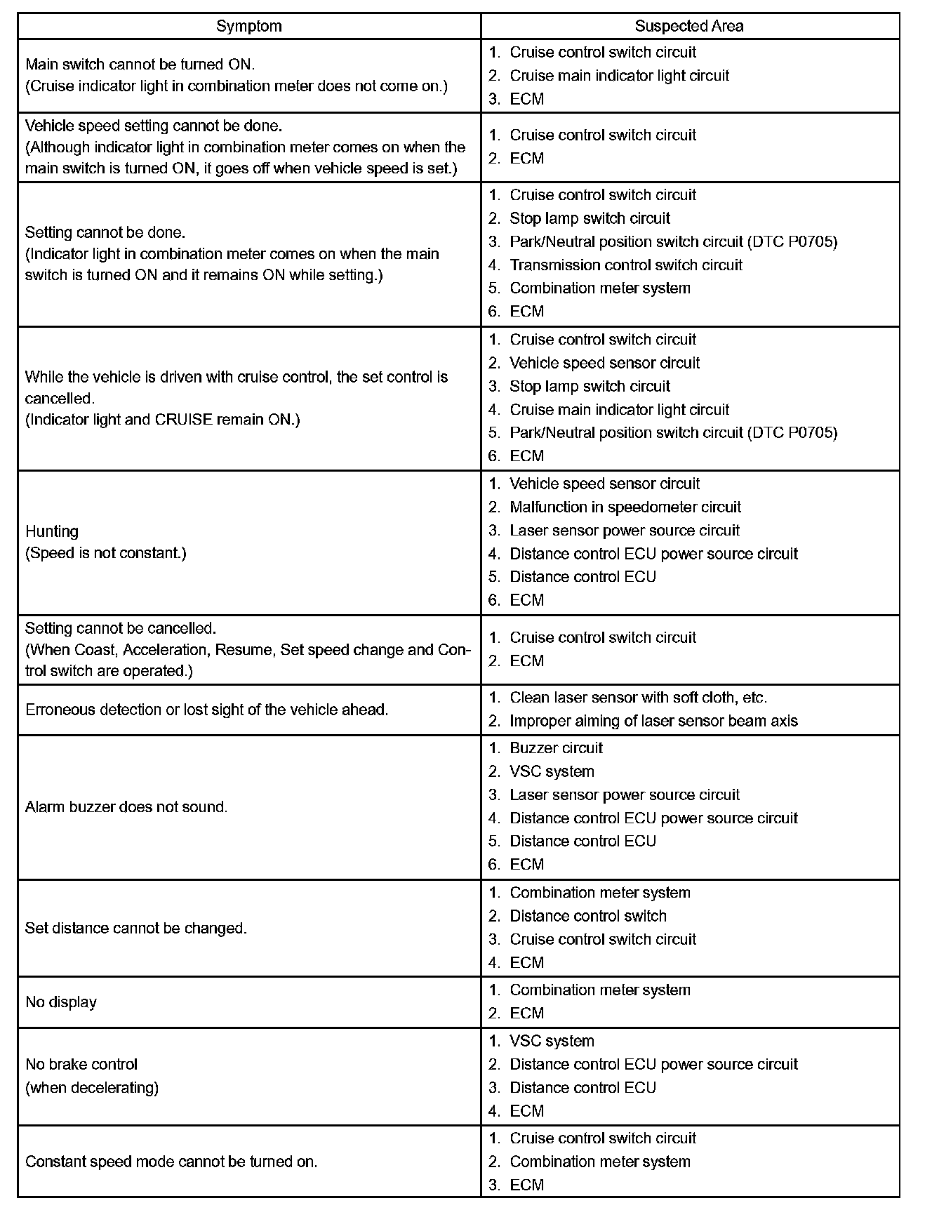 If a normal system code is displayed during the DTC check but the problem still occurs, check the suspected areas for each problem symptom in the order given in the table and proceed to the relevant troubleshooting.
