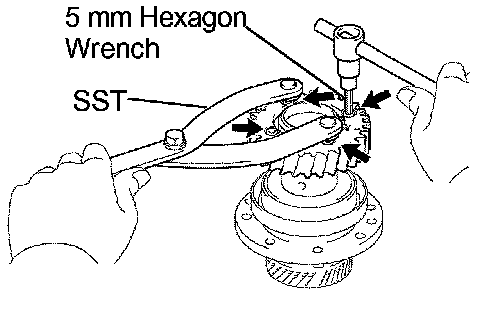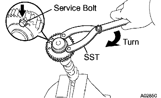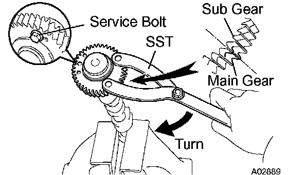 d. Using SST, align the holes of the driven main gear and sub gear by turning the sub gear clockwise, and temporarily install a service bolt.