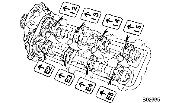 NOTICE: Since the thrust clearance of the camshaft is small, the camshaft must be kept level while it is being removed. If the camshaft is not kept level, the portion of the cylinder head receiving the shaft thrust may crack or be damaged, causing the camshaft to seize or break. To avoid this, the following steps should be carried out.