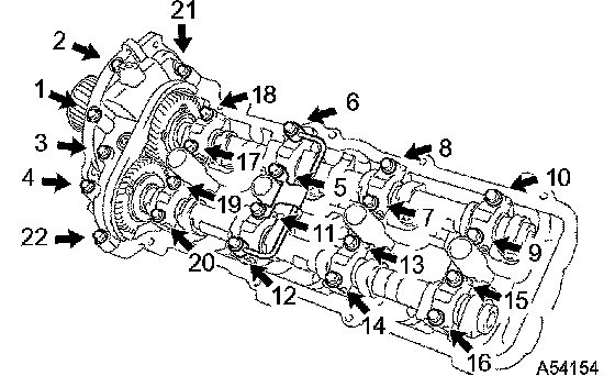 14. Uniformly tighten the 22 bearing cap bolts in several passes in the sequence shown in the illustration.