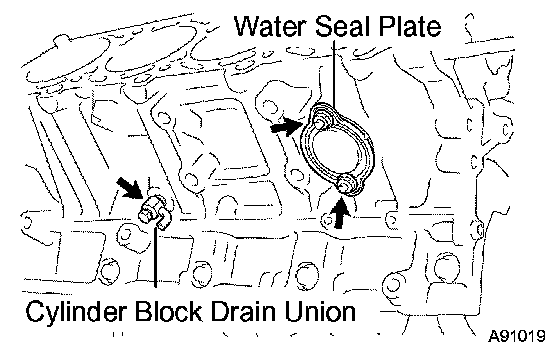 1. REMOVE CYLINDER BLOCK DRAIN COCK SUB-ASSY AND WATER SEAL PLATE