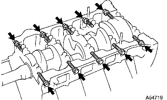 l. Remove the 10 bolts, 20 nuts, 5 crankshaft bearing caps and 5 lower crankshaft bearings (see steps (a) to (c) on the previous pages).