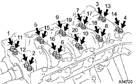 b. Uniformly loosen and remove the 20 crankshaft bearing cap bolts in the sequence shown in the illustration.