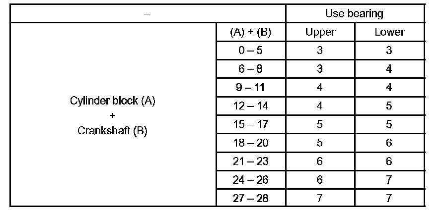 HINT: If using a standard bearing, replace it with one that has the same number. If the number of the bearing cannot be determined, select the correct bearing by adding together the numbers imprinted on the cylinder block and crankshaft, then refer to the table on the next page for the appropriate bearing number. There are 5 sizes of the standard bearings. For No. 1 and No. 5 position bearings, use bearings marked 3, 4, 5, 6 and 7. For other position bearings, use bearings marked 1, 2, 3, 4 and 5.