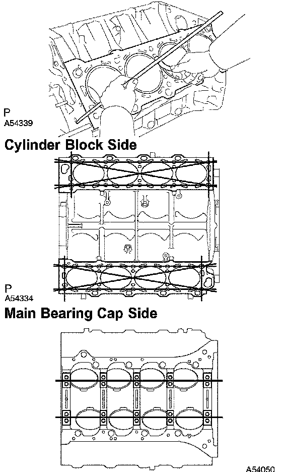 1. Using a precision straight edge and feeler gauge, measure the surfaces contacting the cylinder head and main bearing cap for warpage.