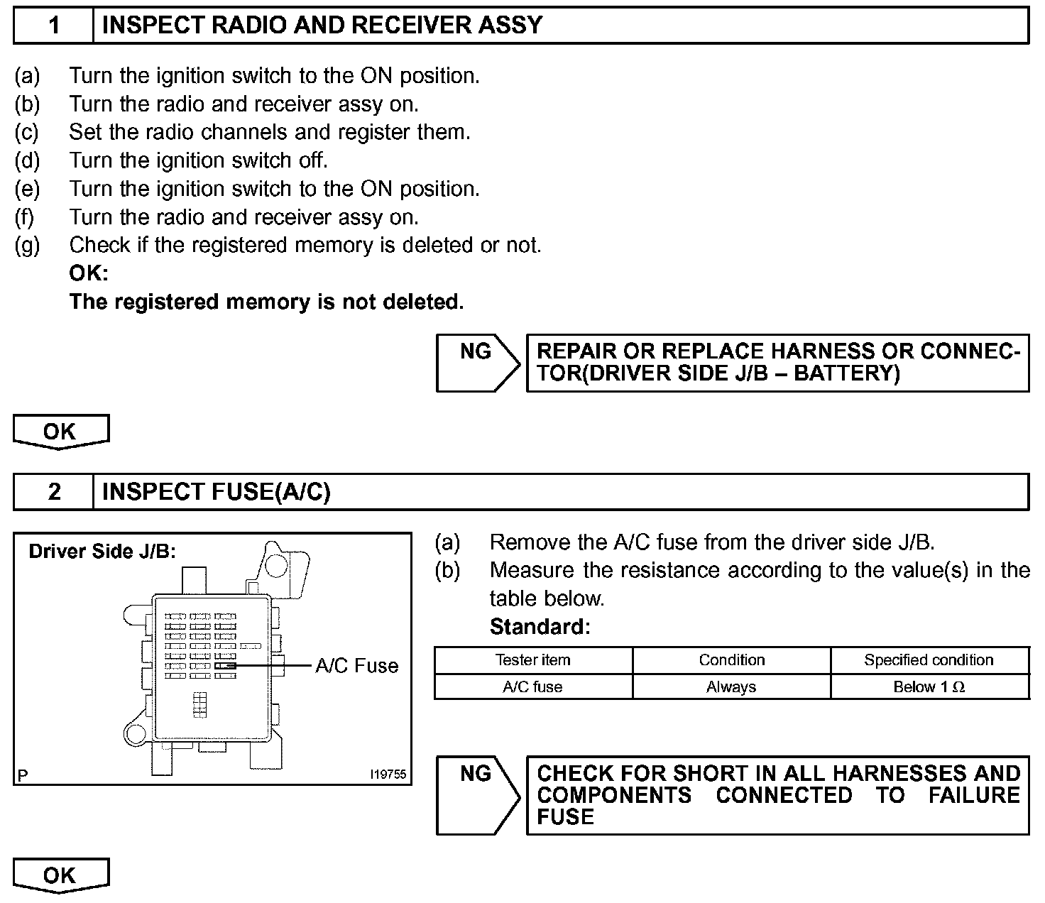 This is the back-up power source circuit for the A/C amplifier. Power is supplied even when turning the ignition switch off and is used for diagnostic trouble code memory, etc.