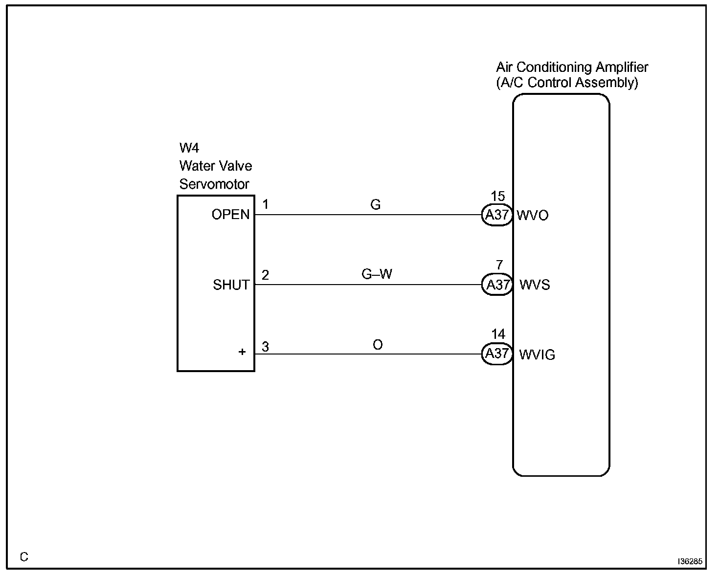 CIRCUIT DESCRIPTIONThis circuit controls the amount of the coolant flowing to the heater core by a signal from the A/C amplifier, and adjusts the temperature at the air outlets.