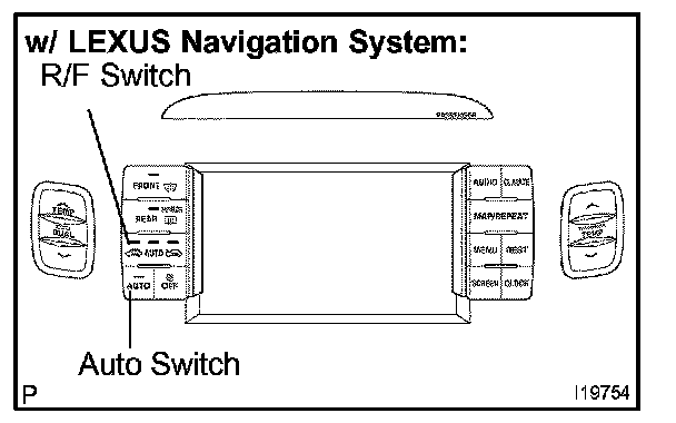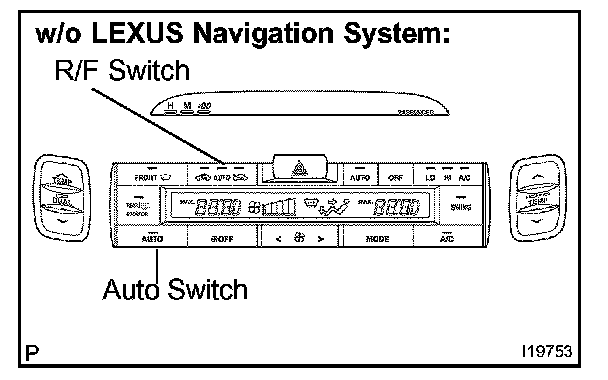 INDICATOR CHECKa. Turn the ignition switch to the ON position while pressing the A/C control AUTO switch and R/F (Recirculation/ Fresh) switch simultaneously.
