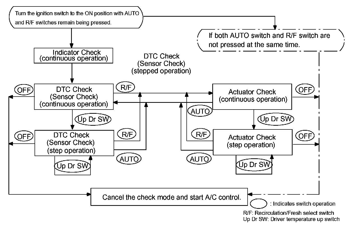 By operating each of the A/C control switches as shown in the diagram, it is possible to enter the diagnostic check mode.