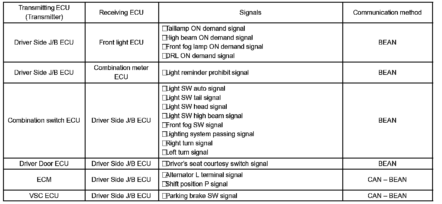 2. The driver side J/B ECU, passenger side J/B ECU, rear door RH ECU and rear door LH ECU send the following based on the signal is listed in (1):
