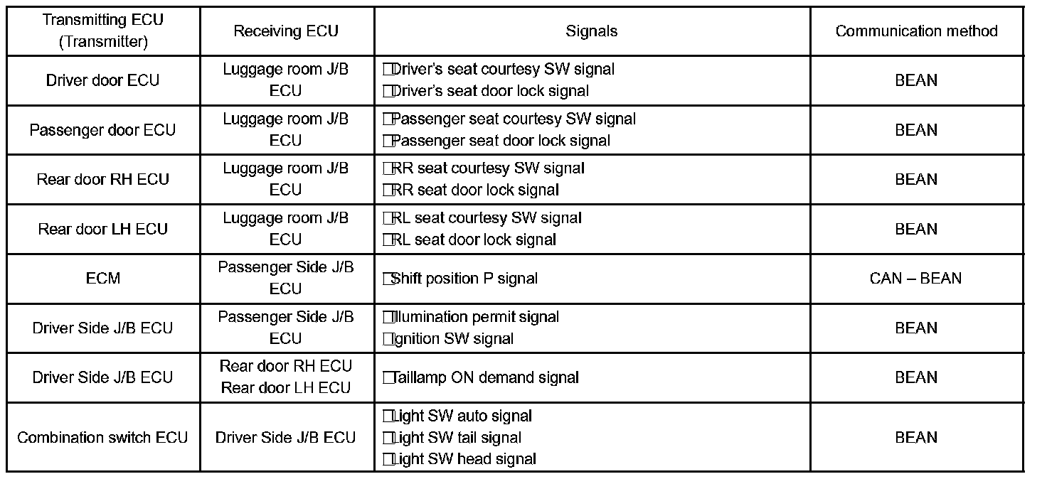 1. The driver side J/B ECU, passenger side J/B ECU, rear door RH ECU and rear door LH ECU receive the following: