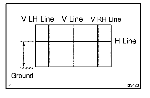 3. V LH line, V RH line (Center mark position of right and left headlamps) Draw vertical lines on the left and right sides of the paper so that they line up with the center mark on the low-beam lights on the vehicle.