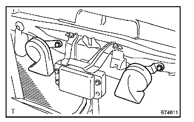 a. Place the stay onto the baffle part in the radiator support upper, and then install the horn with the bolt.