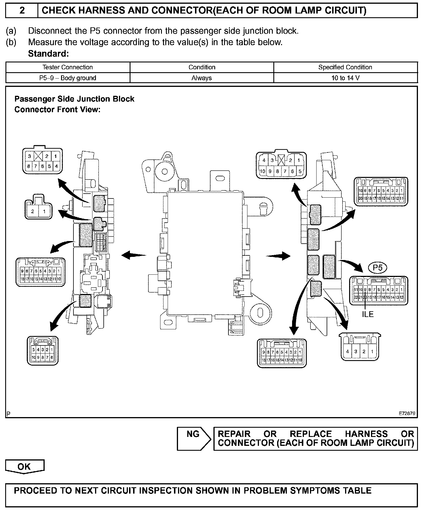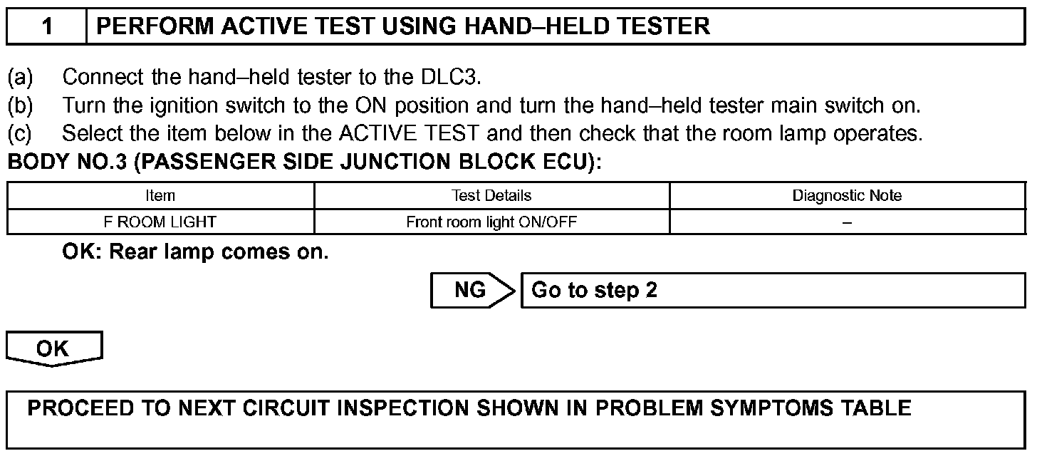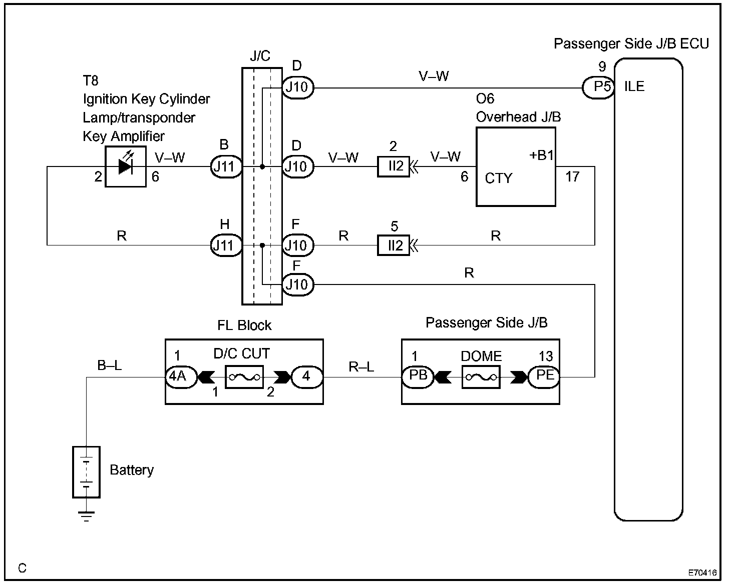 The passenger side junction block ECU receives information regarding the door courtesy, door lock position, ignition switch and other sources, and turns on the key cylinder lamp and room lamp.