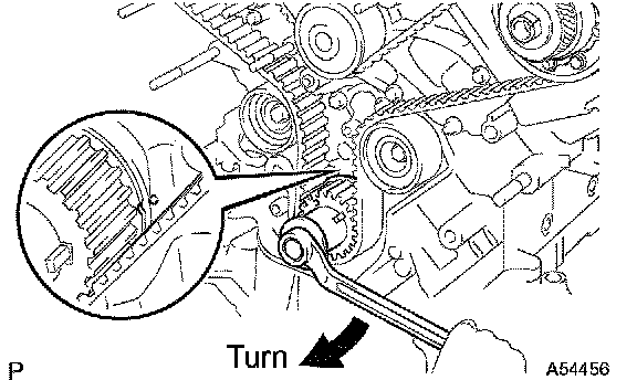 1. Turn the hexagon wrench head portion of the camshaft to align the timing marks of the camshaft timing pulleys and timing belt plates.