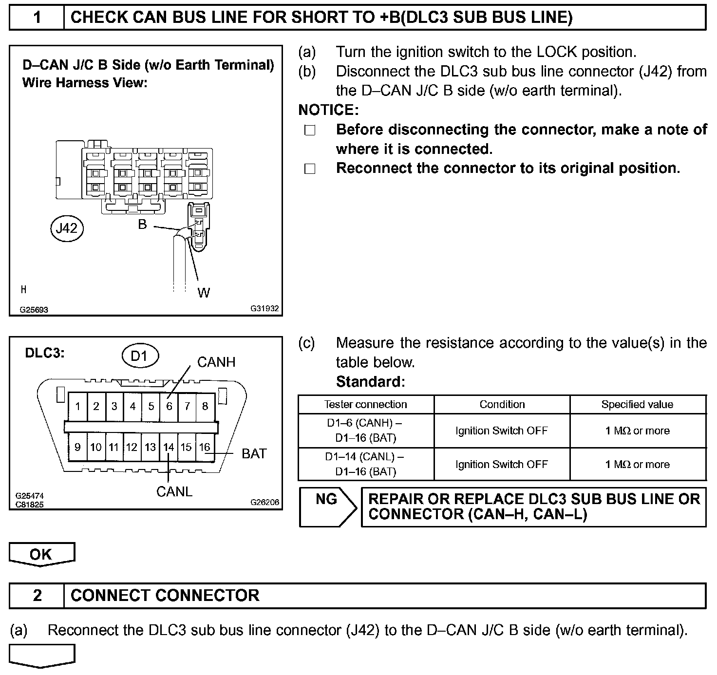 There may be a short circuit between the CAN bus line and +B when there is resistance between terminals 6 (CANH) and 16 (BAT) or terminals 14 (CANL) and 16 (BAT) of the DLC3.