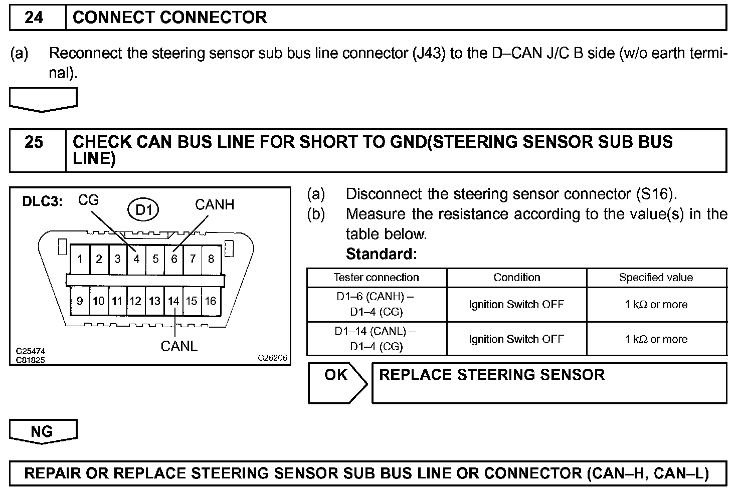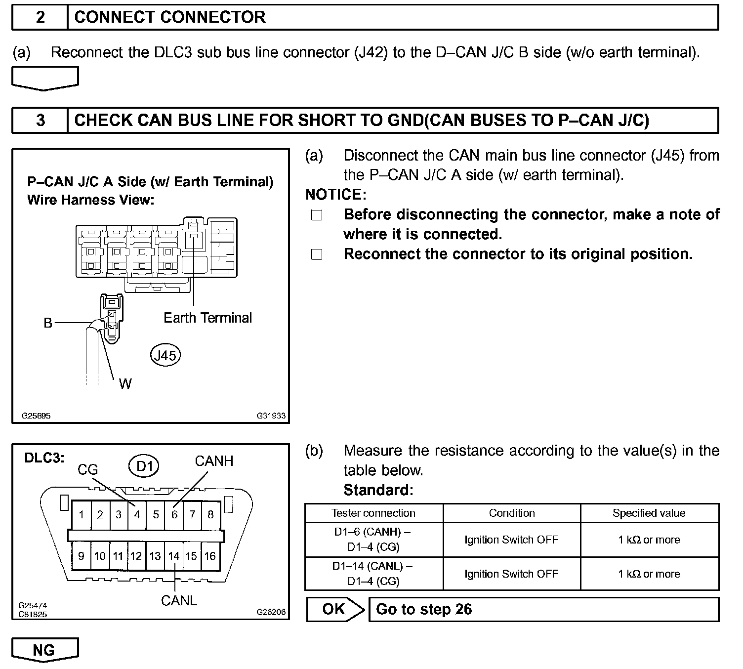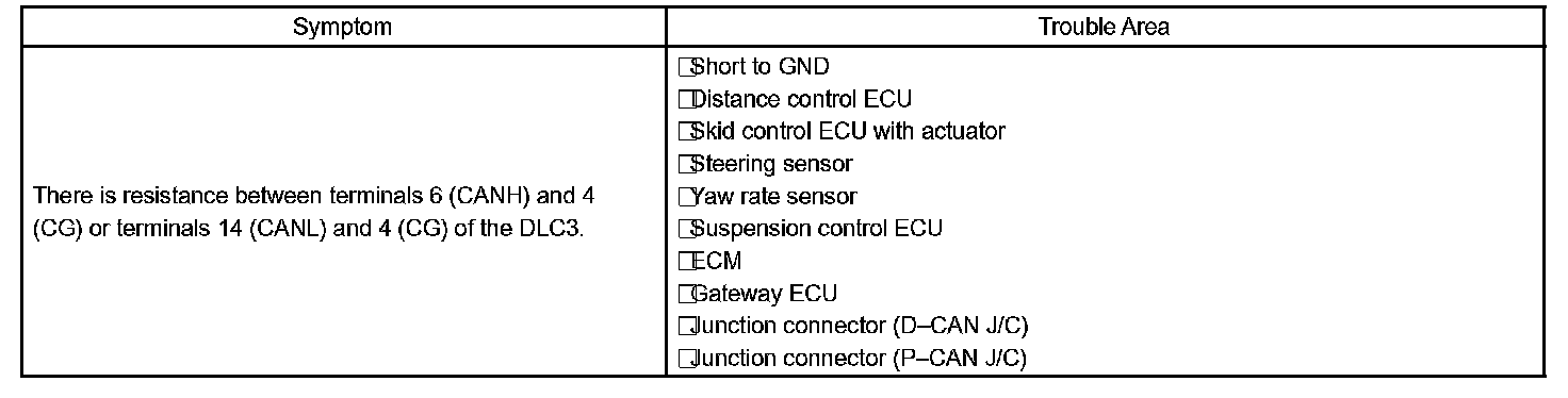 There may be a short circuit between the CAN bus line and GND when there is resistance between terminals 6 (CANH) and 4 (CG) or terminals 14 (CANL) and 4 (CG) of the DLC3.