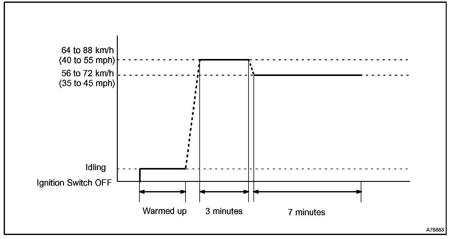 If IAT was less than 10 °C (50 °F) when the engine was started, drive the vehicle at 64 to 88 km/h (40 to 55 mph) for an additional 3 minutes.