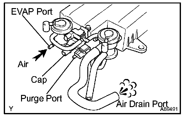 2. While holding the purge port closed, blow air (1.76 kPa, 18 gf/sq.cm, 0.26 psi) into the EVAP port to check that air flows from the air drain port.