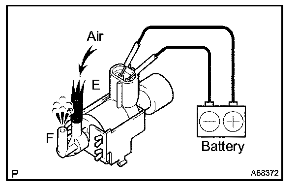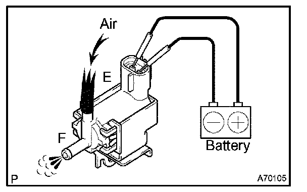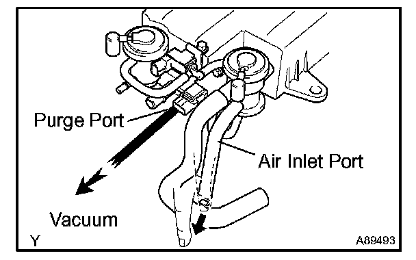 5. While holding the air inlet port closed, apply vacuum (3.43 kPa, 25.7 mmHg, 1.01 in.Hg) to the EVAP port and check that air flows into the purge port.