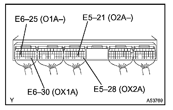 b. Connect the hand-held tester to terminals E5-28 (OX2A) and E5-21 (O2A-) of the ECM.