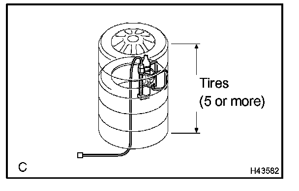 2. Place at least 2 tires over the tire which the curtain shield airbag assy LH is tied to. The top tire should have the disc wheel installed.