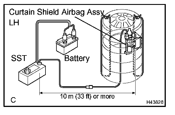 - When deploying the airbag, perform the operation at least 10 m (33 ft) away from the curtain shield airbag assy LH.