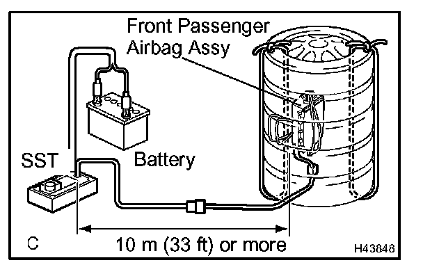 - When deploying the airbag, perform the operation at least 10 m (33 ft) away from the front passenger air-bag assy.