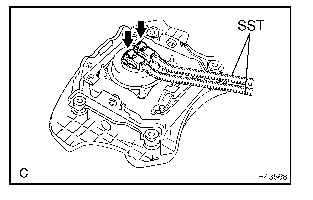 4. Face the upper surface of the horn button assy upward. Separately tie the left and right sides of the horn button assy to the disc wheel through the hub nut holes. Position the SST connector so that it hangs downward through a hub hole in the disc wheel.