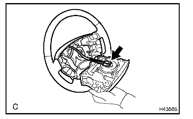 c. Pull out the horn button assy from the steering wheel assy and support the horn button assy with one hand as shown in the illustration.