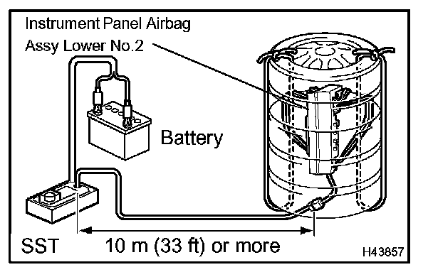 - When deploying the airbag, perform the operation at least 10 m (33 ft) away from the instrument panel air-bag assy lower No.2.