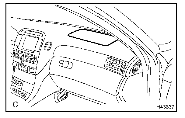b. With the front passenger airbag assy installed on the vehicle, perform a visual check including the following: Cuts, minute cracks or marked discoloration on the instrument panel around the front passenger airbag assy.