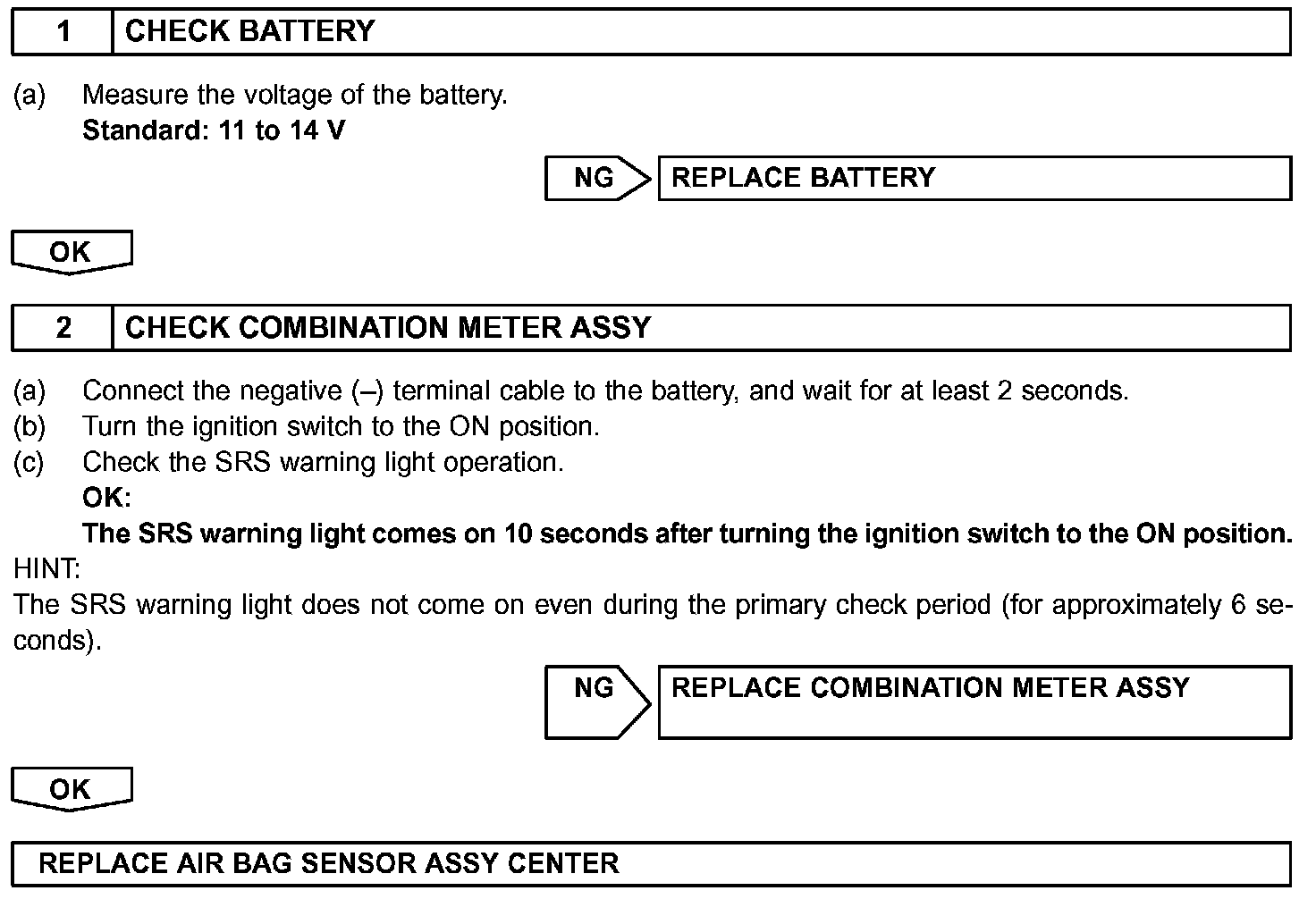 When the SRS is normal, the SRS warning light comes on for approximately 6 seconds after the ignition switch is turned from the LOCK position to the ON position, and then goes off automatically.