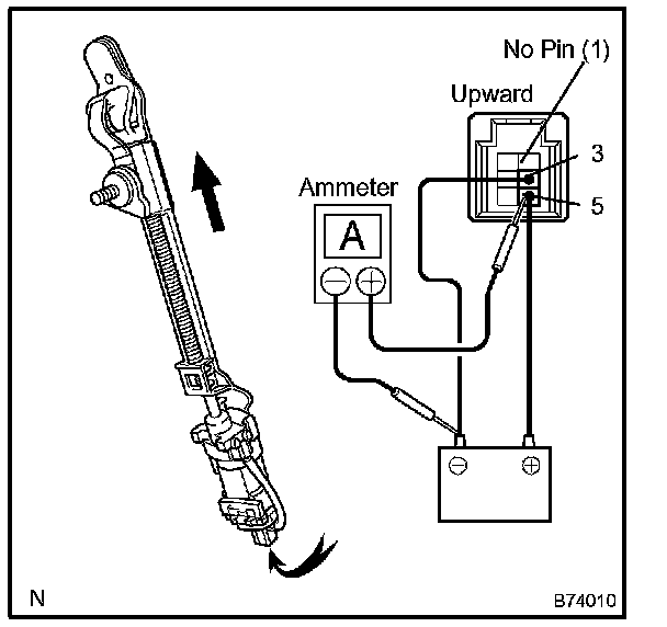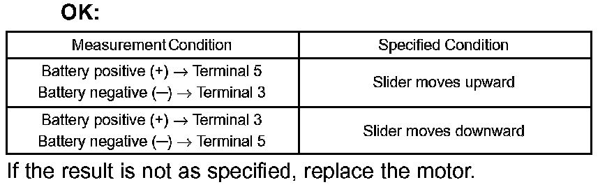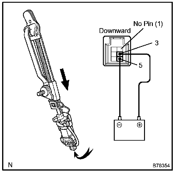 6. Approximately 60 seconds later, connect the battery's positive (+) lead to terminal 3 and the negative (-) lead to terminal 5, and check that the shoulder belt anchor adjuster to downward position.
