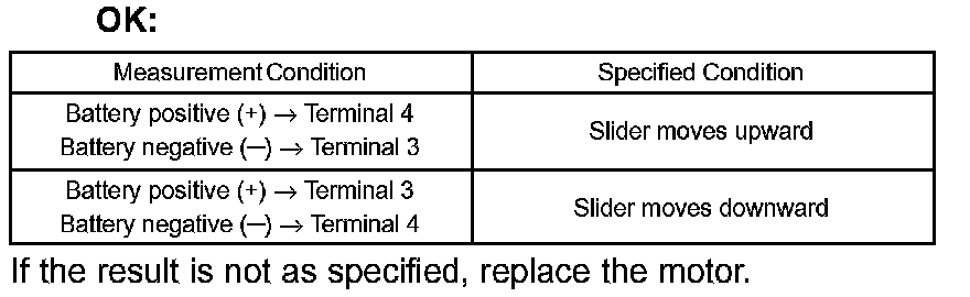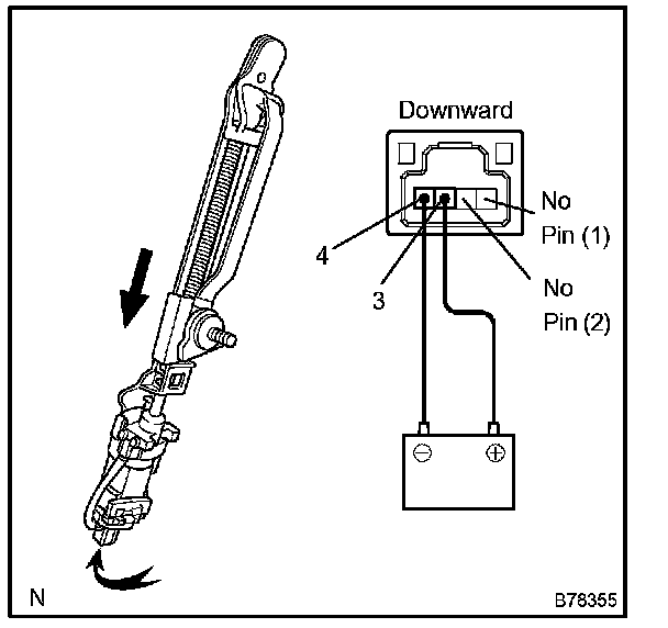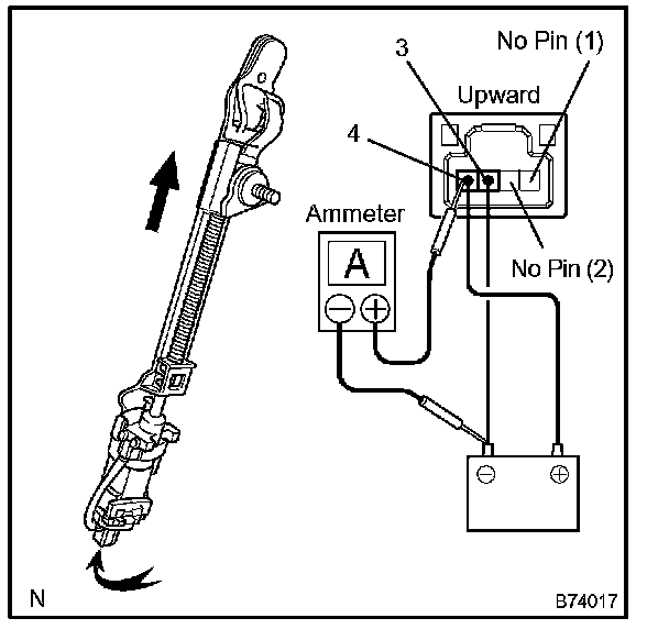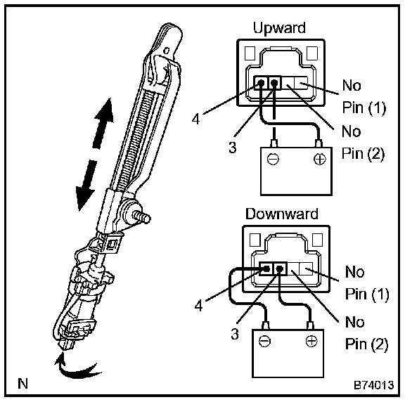 6. Approximately 60 seconds later, connect the battery's positive (+) lead to terminal 3 and the negative (-) lead to terminal 4, and check that the shoulder belt anchor adjuster to downward position.