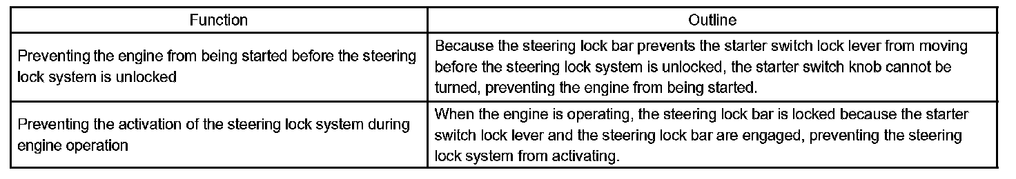 In the steering lock system, the steering lock motor operates in accordance with signals from the steering lock ECU. This causes the gear to rotate as well as the cam that is integrated with the gear, and the cam pushes the steering lock bar up, disengaging it from the steering lock holder.