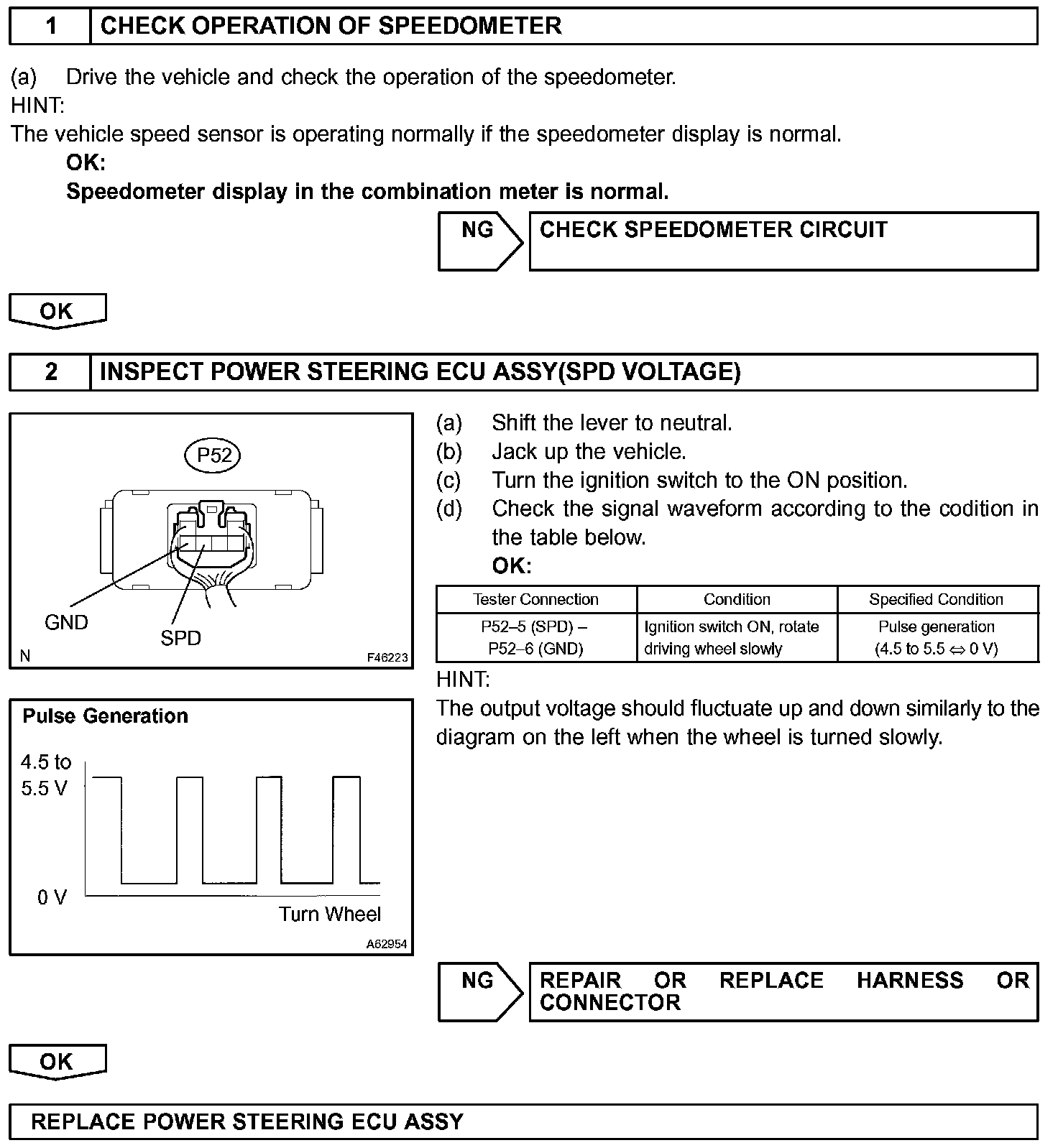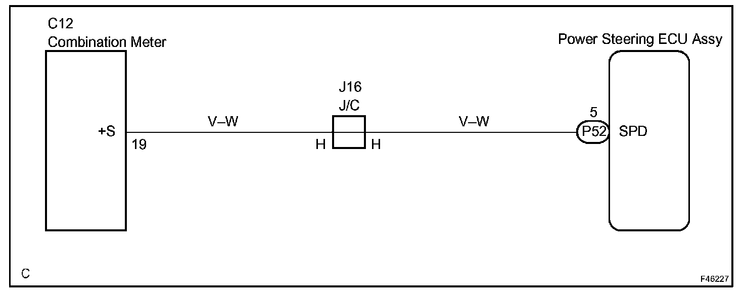 CIRCUIT DESCRIPTIONIn the vehicle speed signal circuit, the combination meter sends a vehicle speed signal to the power steering ECU assy. The power steering ECU assy controls the output current to the PPS linear solenoid valve assy based on this signal.