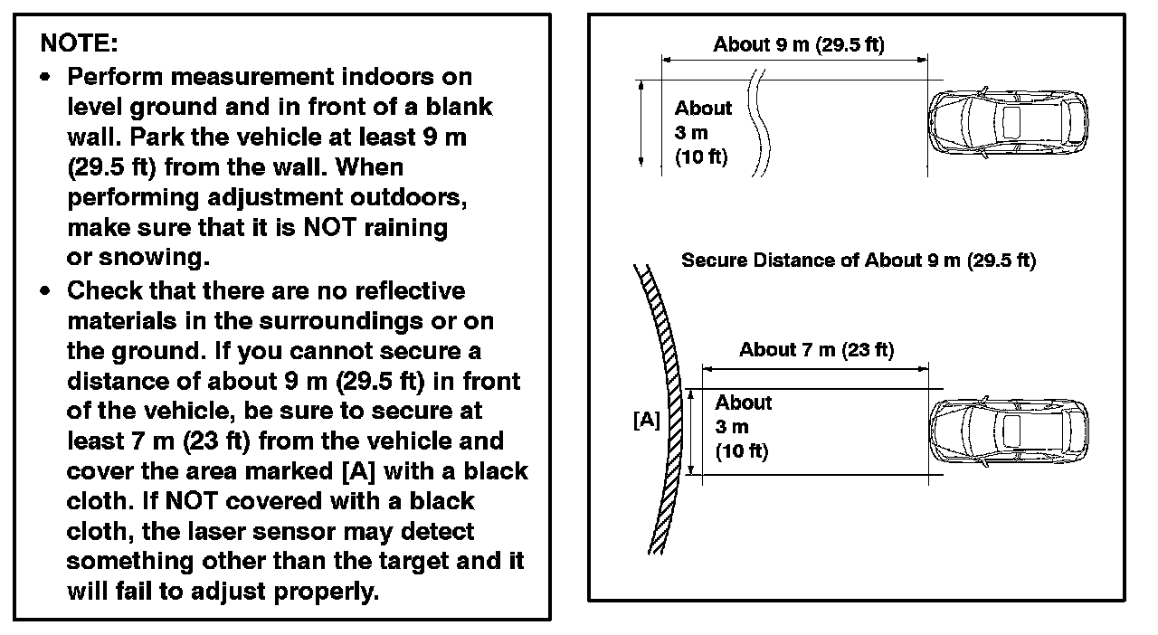 ^ Perform measurement indoors on level ground and in front of a blank wall. Park the vehicle at least 9 m (29.5 ft) from the wall. When performing adjustment outdoors, make sure that it is NOT raining or snowing.