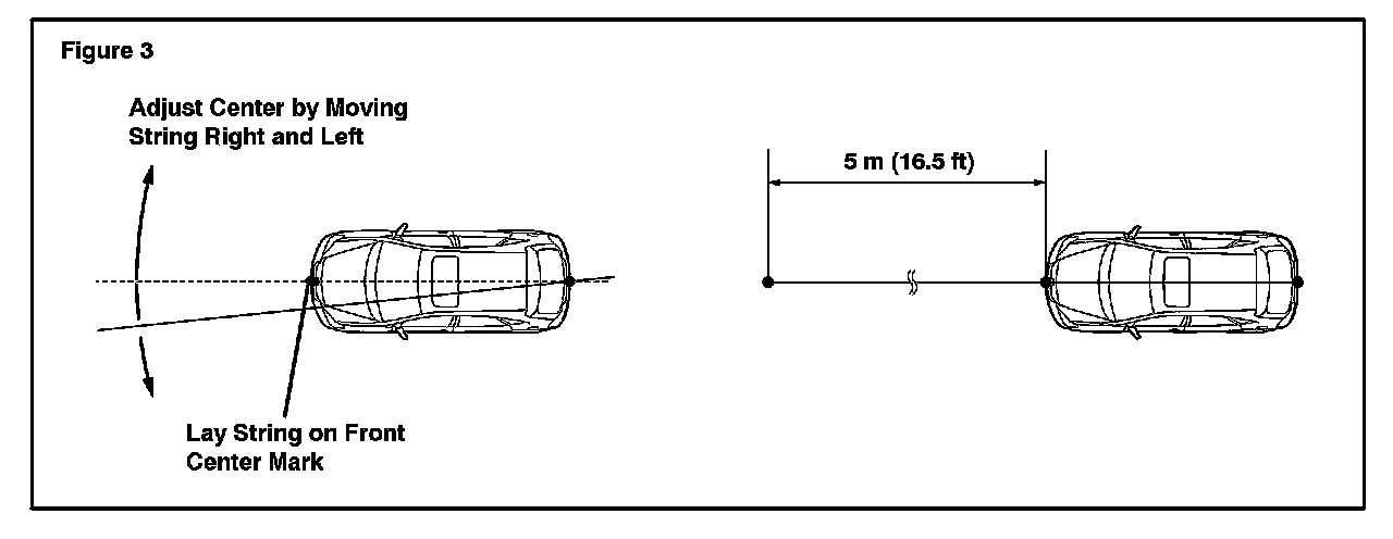 D. Fix one end of the string to the rear center mark and adjust the other end so that the string will line up with the front center mark of the vehicle. Make a mark 5 m (16.5 ft) from the front of the vehicle where the string and the front vehicle center mark intersect.