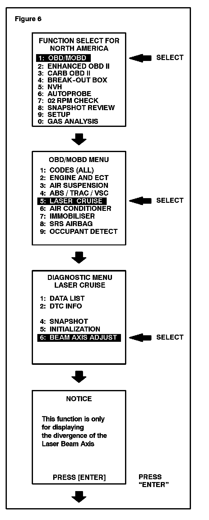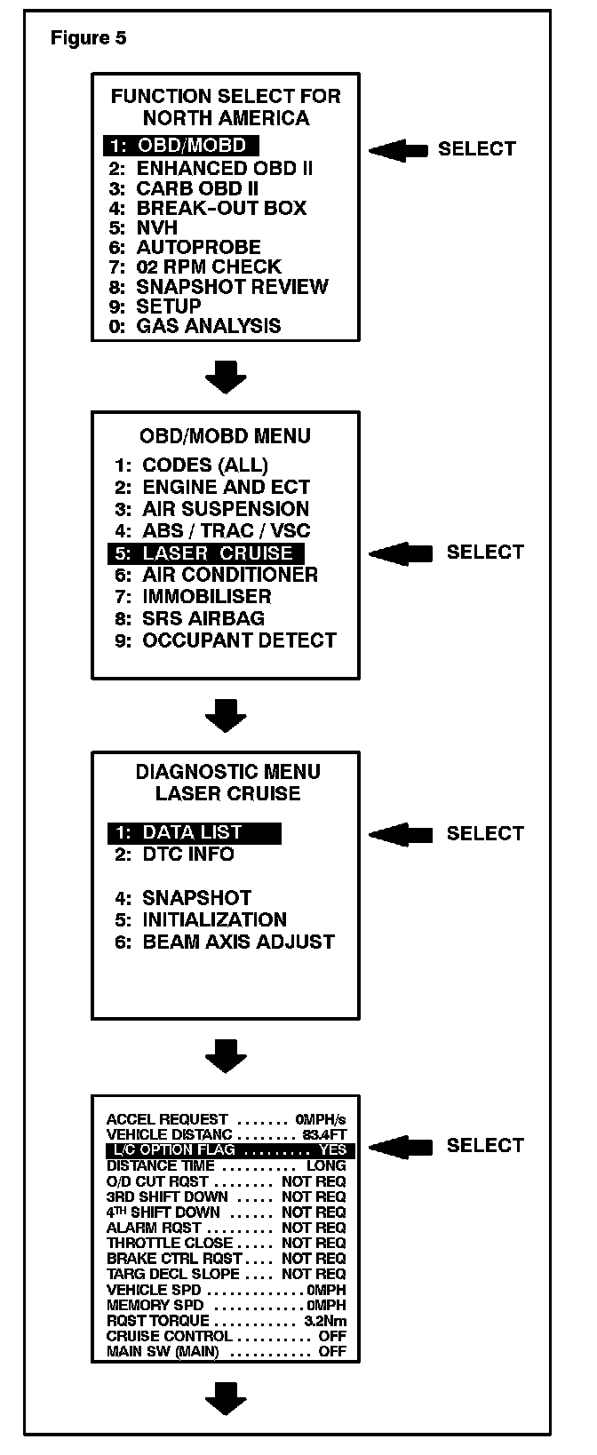 If the L/C Option Flag is NOT set to "YES" in the Data List after performing the L/C Option Flag selection procedure and the beep is heard, perform the "INITIALIZATION" option from the "LASER CRUISE" menu on the Diagnostic Tester.